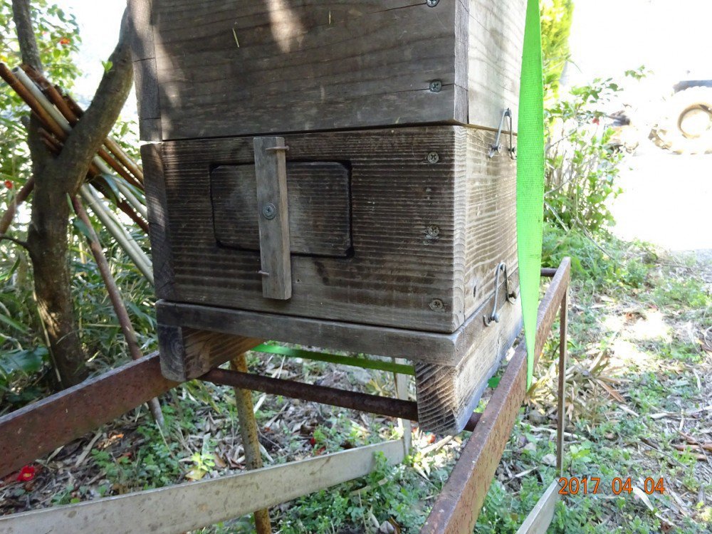 実は、この飼育箱はハチを頂いた知り合いから新品で譲り受けたもので、2~3年くらいの期間、待ち箱として自然へ放置していました。そのため雨風に晒されたので見掛け的には年季が入っています。待った甲斐なくハチが入居する様子もなかったので、昨年その知り合いから1群頂いたという経緯があります。