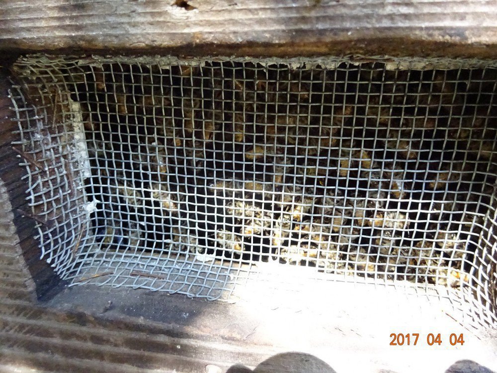 一段目の箱を乗せているの台には、箱の後側面(写真)に作ってあるような通気口(約15㎝角の金網貼り)があります。この通気口を通して下から飼育箱内部が観察できるので、1月には蓋が開いたのですが先日は素手では開けることが出来ませんでした。ハチが蝋みたいなものでくっつけているのだろうと思われます。