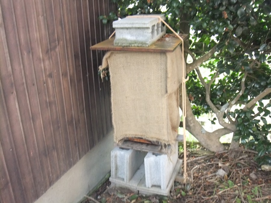 実家の農機具置き場の横に置いて冬越しさせた弱小群が分蜂したようです。