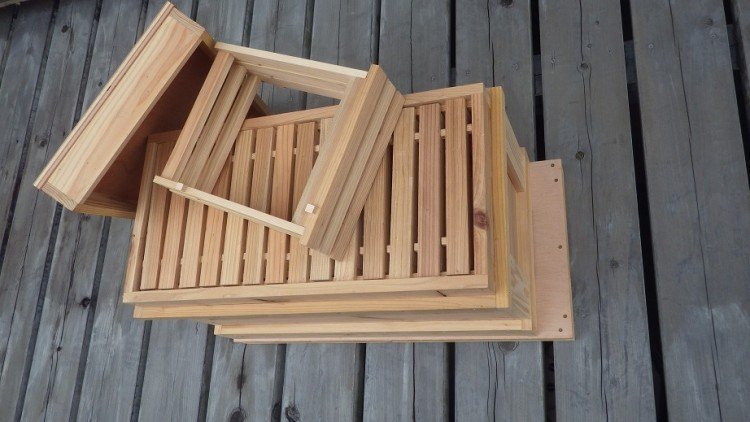 オタク蜂飼いさんありがとうございます カ式の資料集めに時間が掛りまた当初のバー加工に手間取りました、ただ暇人ですから図面が出来たら箱は1日で製作しましたまだまだ問題点が有り進化中です、桐材の凄い重箱製作中ですね完成期待しています。