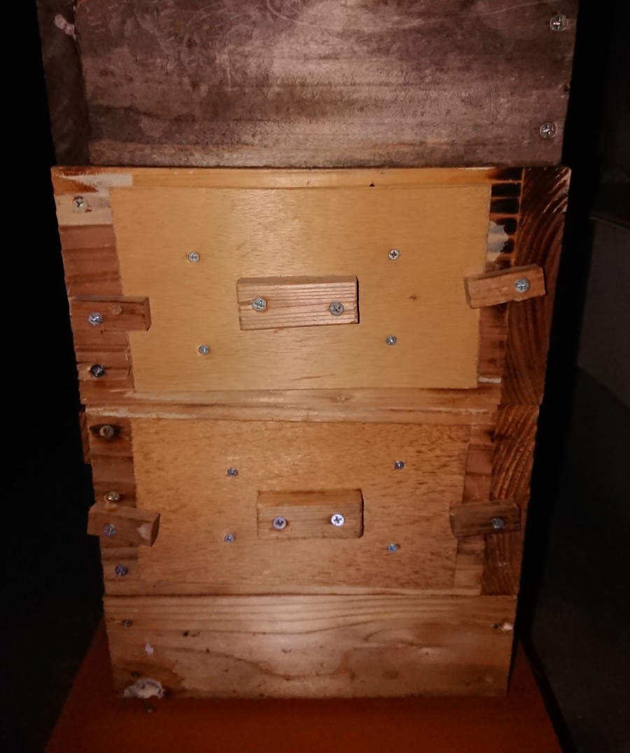 tototoさん、こんばんわ、返事が遅くなりました。重箱内のビスは、内部観察用に窓を開け、内側に透明プラスチック板をビス止めしたところです。この群では有りませんが元巣の観察窓付き重箱写真を添付します。