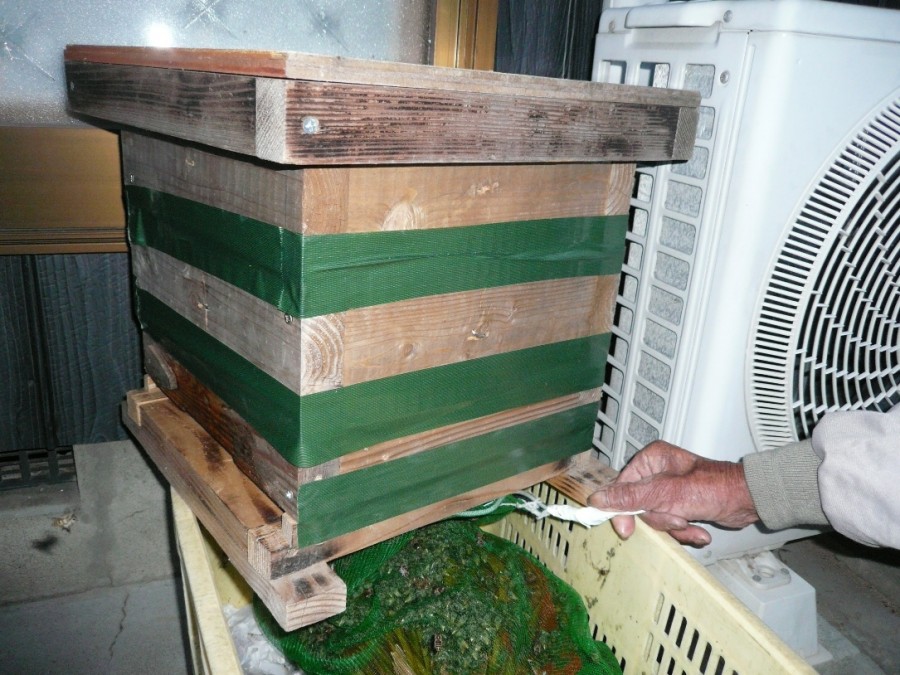 ①よく考えてみると、待ち箱のキンリョウヘンに群がつてるミツバチは、その待ち箱と同じ群ですよね?したがって、昨夜捕獲ネットより待ち箱に移動させて、元の位置に戻したのは、捕獲ネットのままでよかったようです。せっかく、持っていきましたので、待ち箱の上にセットしました。