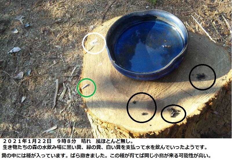 糞から小鳥の名前を調べるテクニックを持ち合わせていないので、分からないが3種類の糞が有る事から3種類の小鳥が来た可能性もある。