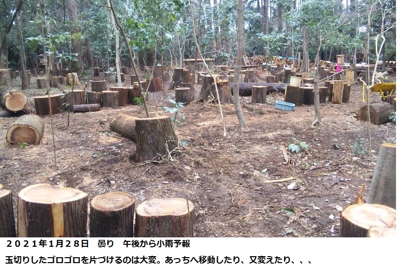 今にも降り出しそうな気配なので、玉切りしたのを配置換えしただけで、チェンソーは降ろさなかった。
