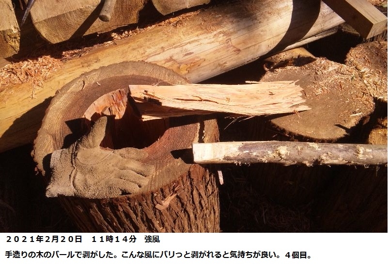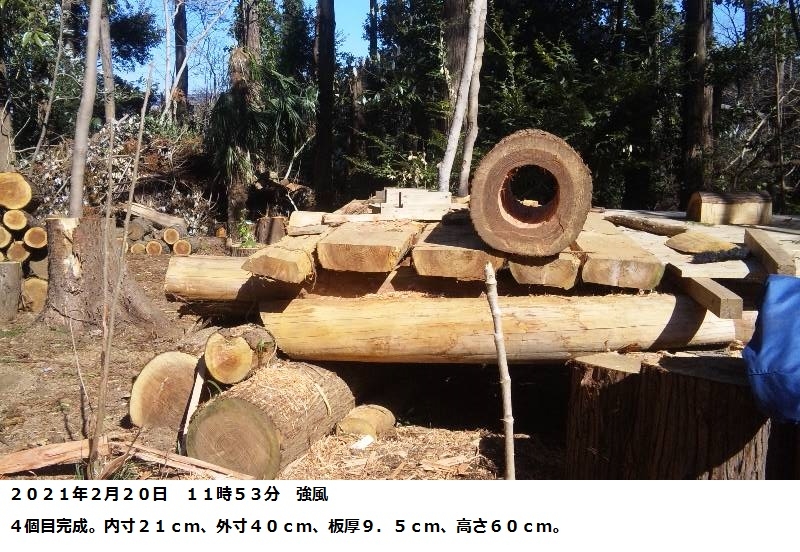 伐採して刳り貫いて、年輪にそって剥がして完成らしきところまで4時間位で出来そう。