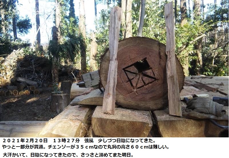 突っ込み作業の時は天井と裏との位置合わせが一番難しい。5個目から丸洞を腰の高さの(瞑想の空間) 舞台に載せたので、チェンソの突っ込みの位置がずれない。