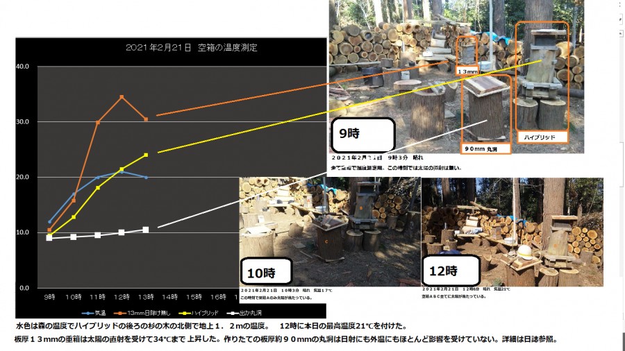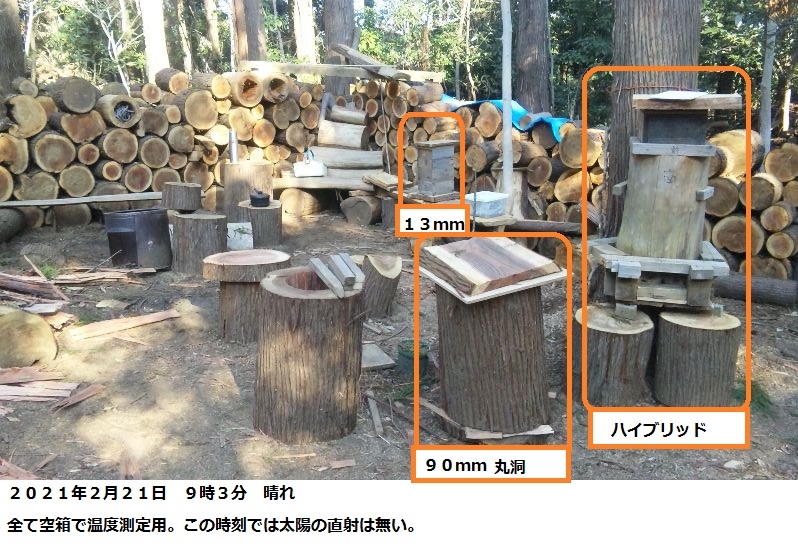 先日から13mm板厚など空箱の温度測定をしてきたが、出来立てほやほやの水分を含んだ丸洞も、本日から温度測定に加わる。