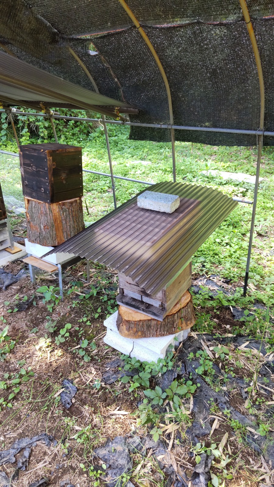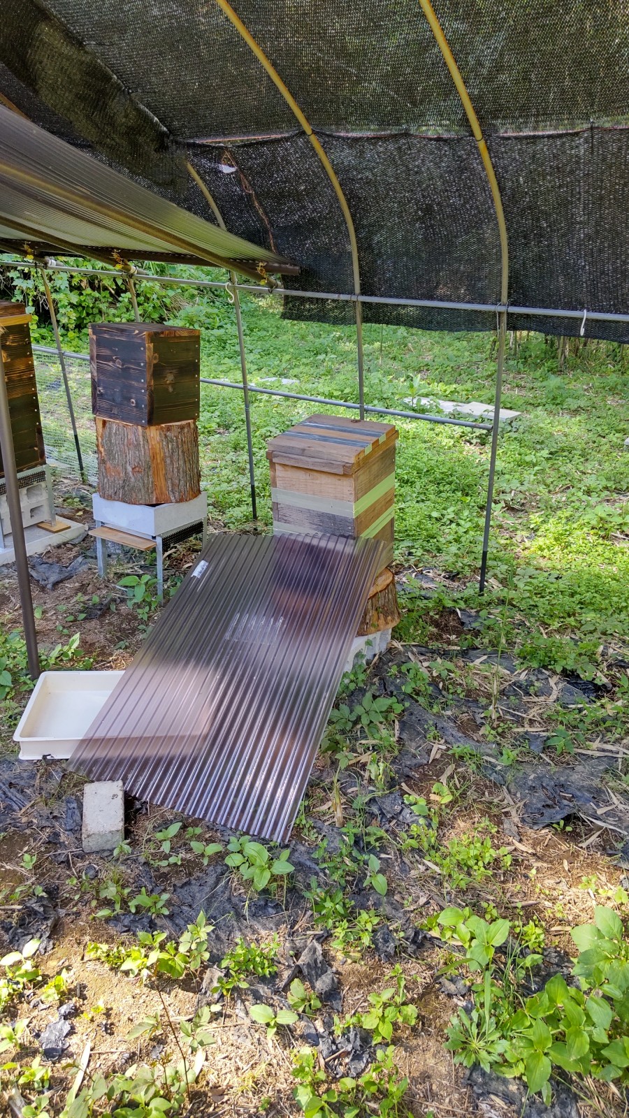 うちは、猿軍団でした。幸い、群の住んでいるタワマンではなく、待ち箱として置いてある隣の蜂箱ですが、ベニヤ板の上に乗せておいた瓦と石が落ち、ベニヤ板が落ちていました。上に乗った時にバランスが悪く落ちたと思われます。