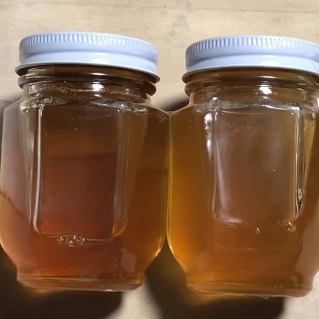 面白いのが西洋蜜蜂がいる所に、2年前に日本蜜蜂がいて同じ時期に貯めた蜜がかなり違うのです。左が西洋蜜蜂で右が日本蜜蜂です。