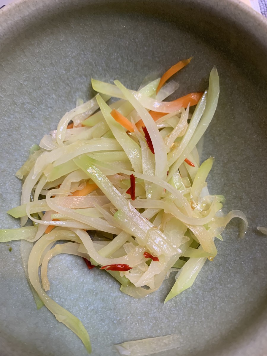 火を通すとパパイヤは柔らかくなって食べ易いです。強いて言うと切干大根の様な食感。唐辛子がピリッと効いてご飯が進みました(笑)