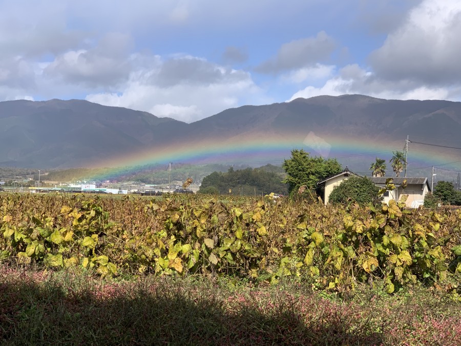 出発時は快晴でしたが県北に行くに従って雲が厚くなり小雨が降ってきたりしましたが、天候は回復し綺麗な虹が迎えてくれました。低い位置での珍しい虹です。