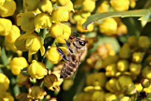 八朔の樹下にムスカリが繁茂していますが樹陰なので花径が長く伸びています。そのムスカリにセイヨウミツバチが訪れて花粉を収集していました。我がちびっ娘達は分蜂の準備に大童なのかまだ気づいていない様です。