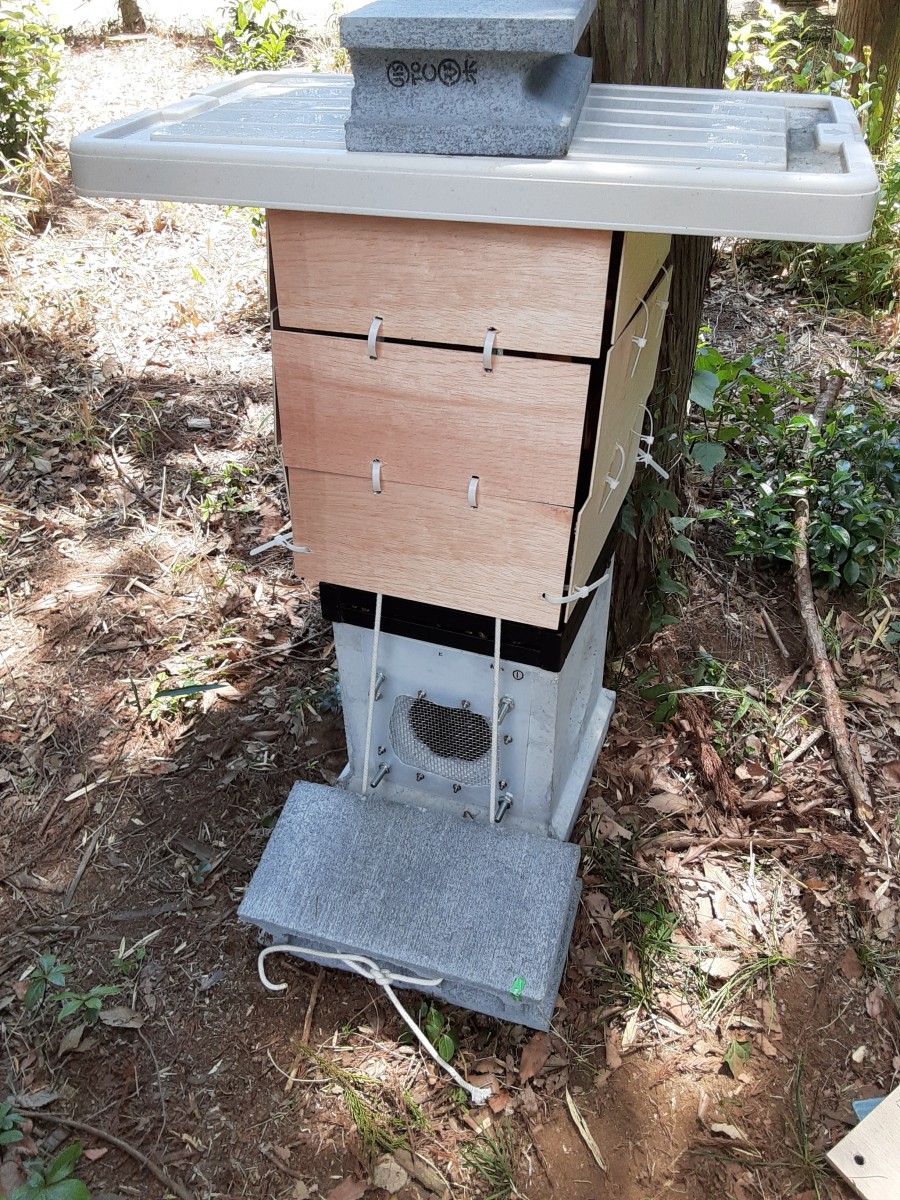 昨日作成した観察蓋ともう一つの暑さ対策、これで思い描いた形にできたのではと思っています。疎らではありますが木がまわりにあるのでそこまでしなくてもいいのかもしれません。しかしできることはやっておきたい、っていうかやらなくて初めてニホンミツバチの自然入居した群が逃亡して後悔したくないという精神です(笑)これで巣落ちして逃亡したらどうしよう…