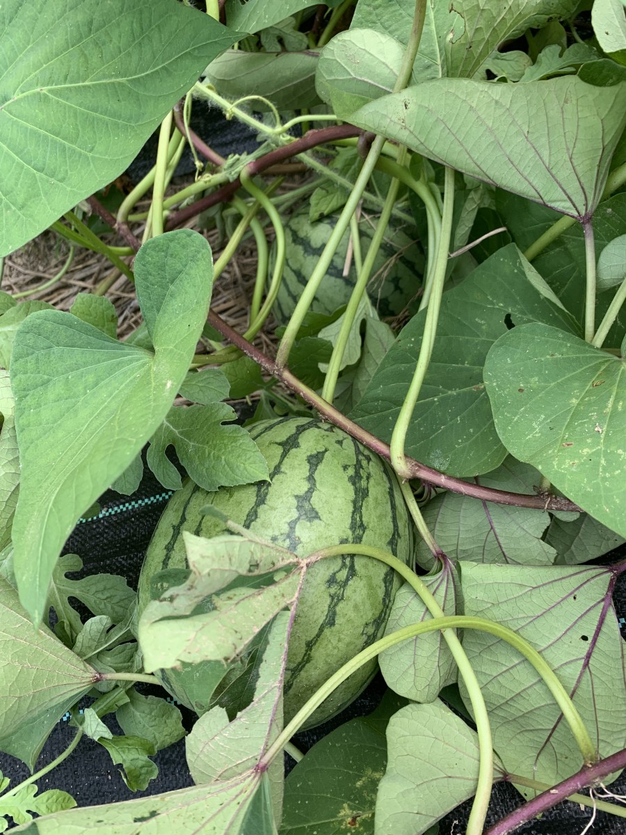 スイカ3個〜サツマイモと、共存して〜隠れて居たのですねー^ ^発見した時の喜びは〜宝くじが当たった位(^з^)-☆嬉しいですねー♪来年も、やる気が湧きます♪清水白桃は、2カ所から〜お願いしました^ ^比べて見たくて。黄桃〜も好きです!又、お願いして見ますねー♪有難う御座います。