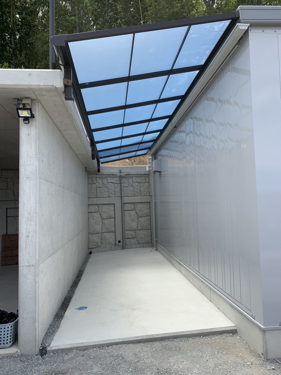 倉庫2棟の間の空きスペースに屋根が出来ました。単車置き場にも使えそうです。