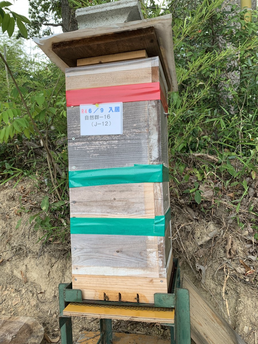 待ち受け箱を設置する際に昔作った巣箱を利用した事からの結果ですが、この群については今年の採蜜はせず、上手く越冬出来たら来春の状況により可能で有れば採蜜という段取りになると思います。