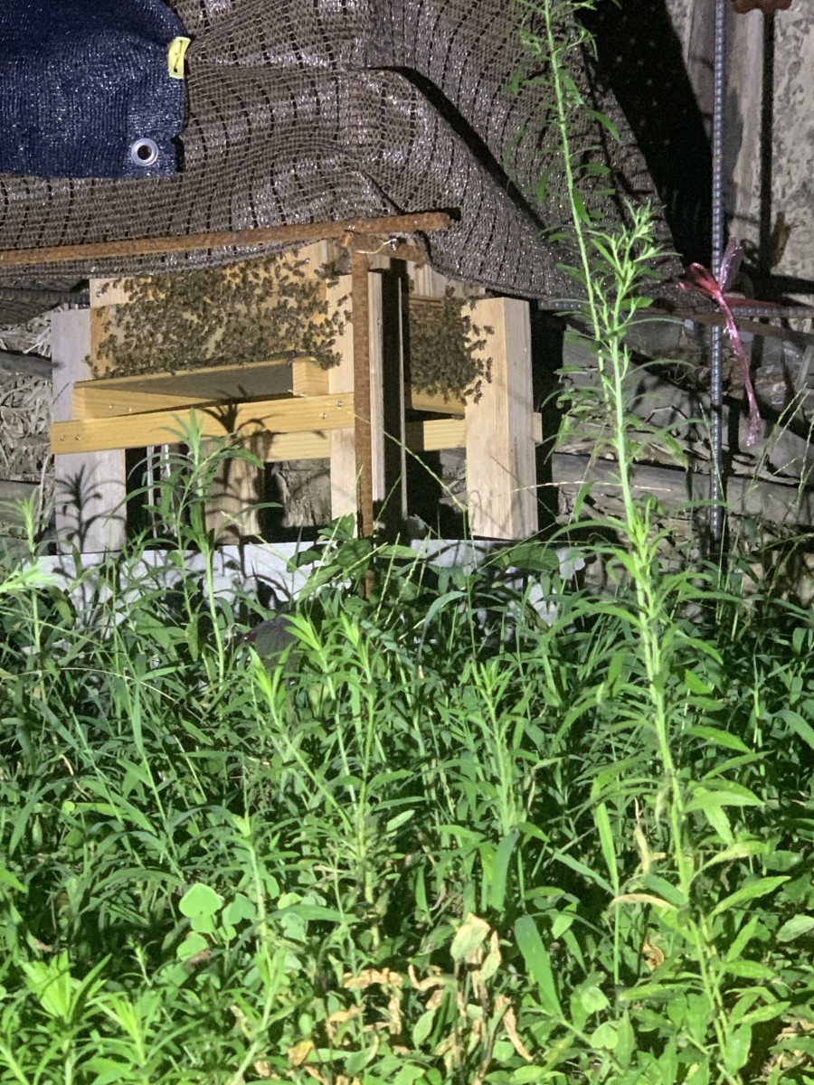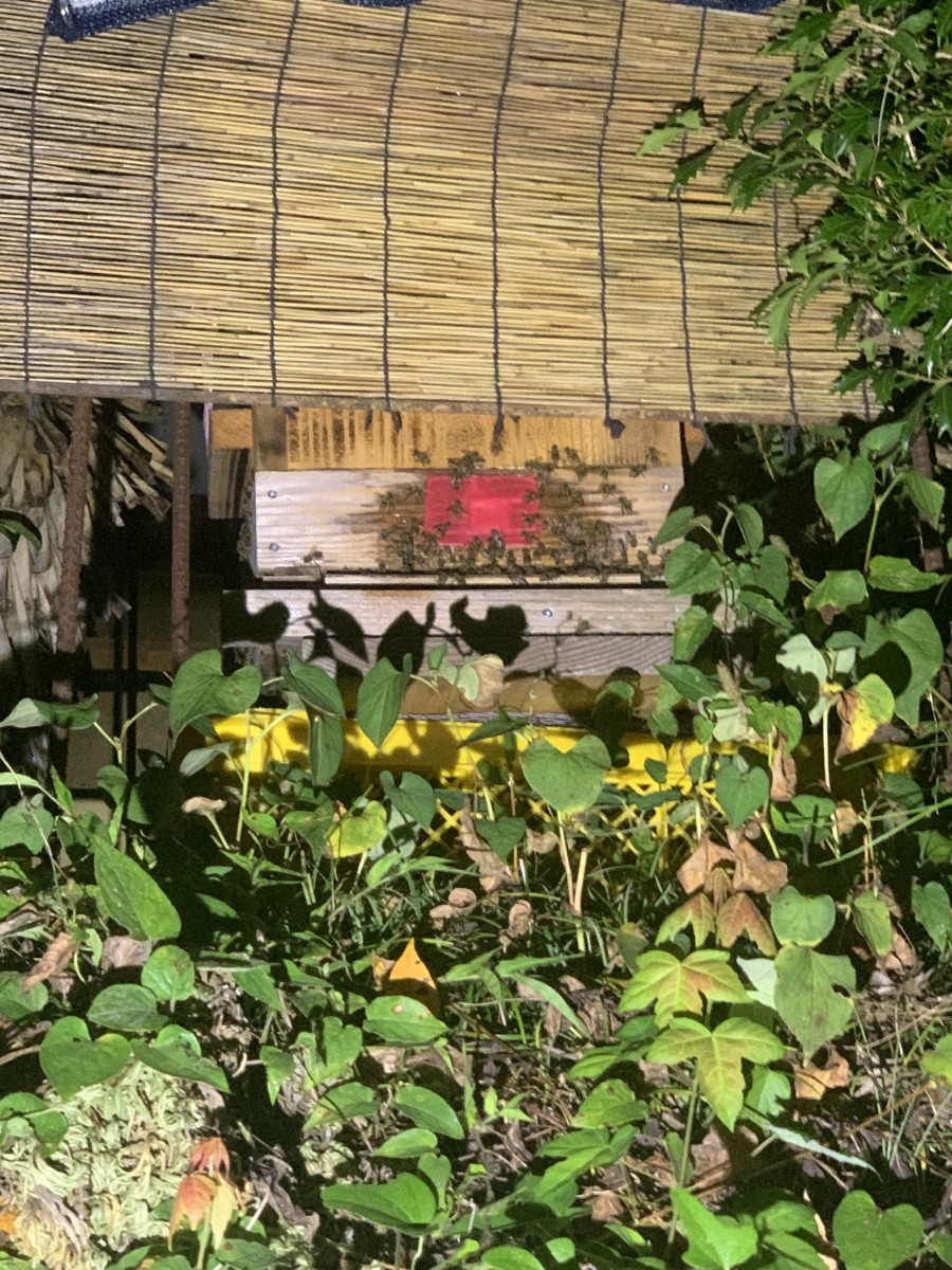 これだけ蜂が外に出ている群は初めての経験です。巣箱内は余裕は有ると思いますし夜間でもありそのままにしておきました。