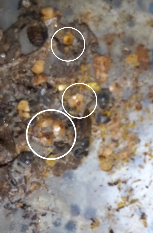 少しだけ気になることが…雄蜂の蓋らしき物を見つけました。6月に入居してから始めてのことです。前回見回ったのが3週間前だったのでその間に巣盤から落ちてきた物だと思われます。数は多くなかったのですが、この時期に雄蜂が産まれることがあるのかと思ってます。
