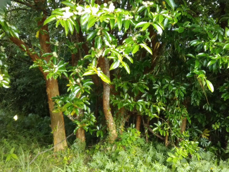 そうですね! 常緑広葉樹なので、花は目立たないですが、大木になると、樹皮が剥け、赤い肌が目立ちますね!ただ、集中して大木を見た事ないですね!・・・50cm以下の幼木は、沢山見ます。(私も当初は、ビワの実生と間違えました)・・・実が熟したら、ヒヨドリが食べて、下に種子が一杯落ちますので、・・・自生しやすい木なんでしょうね!