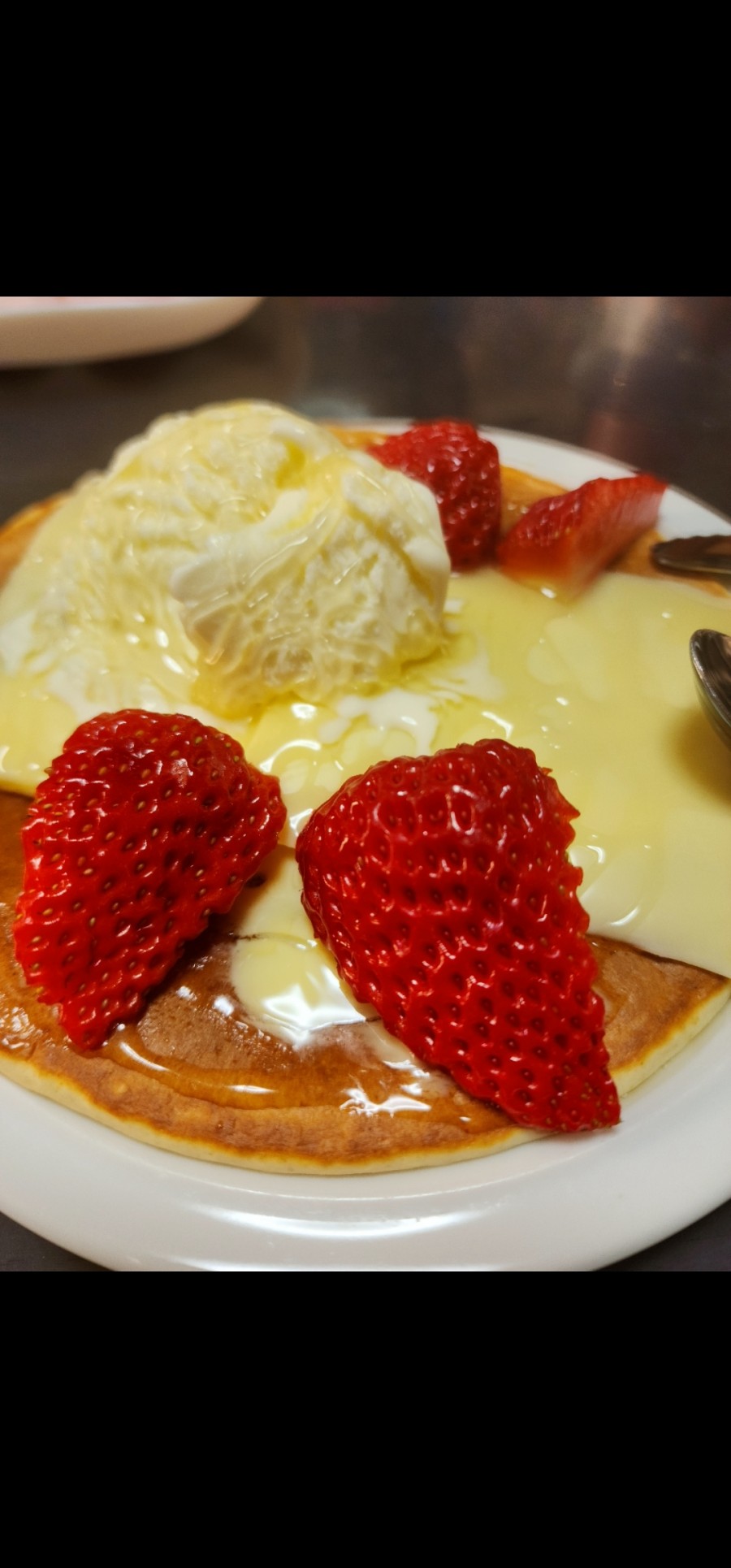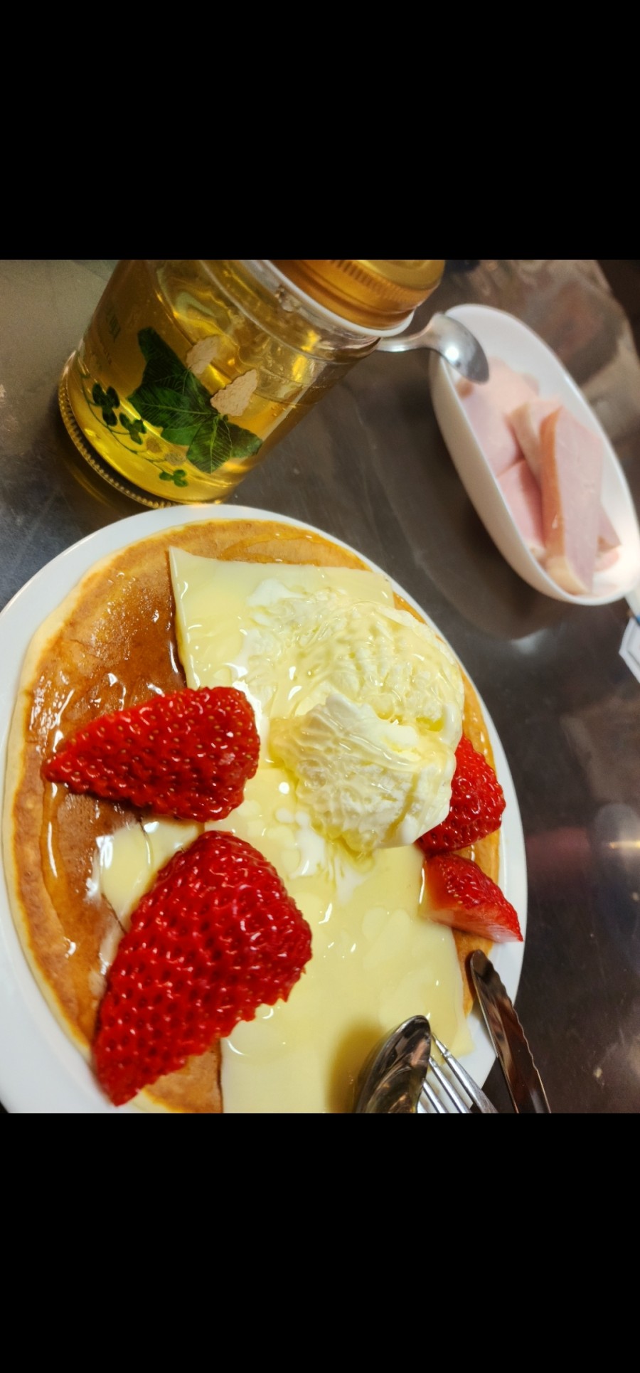パンケーキにスライスチーズとアイスクリーム乗せですか^ ^ ストロベリーのトッピングに蜂蜜かけですね