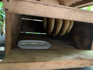移動前のチェック・・雄蜂の巣が増えています。晴れの日が多い昨今、色とりどりの花粉を集めている様子が嬉しいです。ヤシ群の巣箱をガゼボから夕方7時(暗くなり始め)に7m程離れた新居に移動しました。翌日、多くの蜂が元いた場所と新しい場所を行き来するように飛び回っていました。この日は夕方になっても、20−30匹ぐらいは元の場所に残りました。しかし、翌々日の夕方には全蜂、新しい場所に落ち着いたようです。