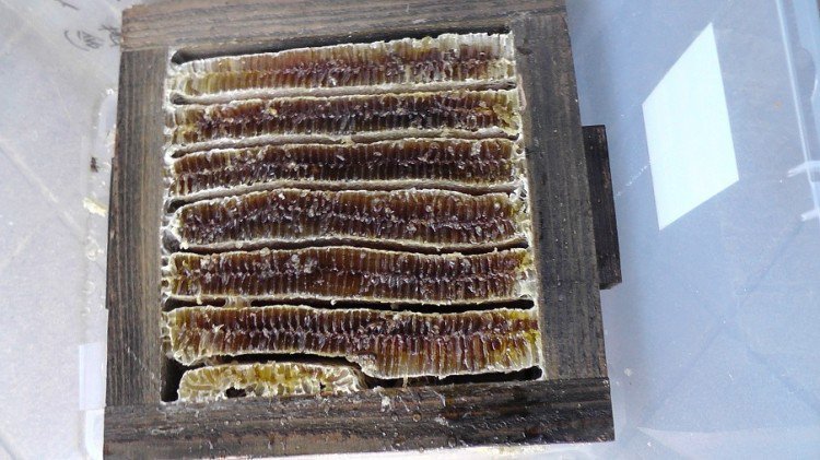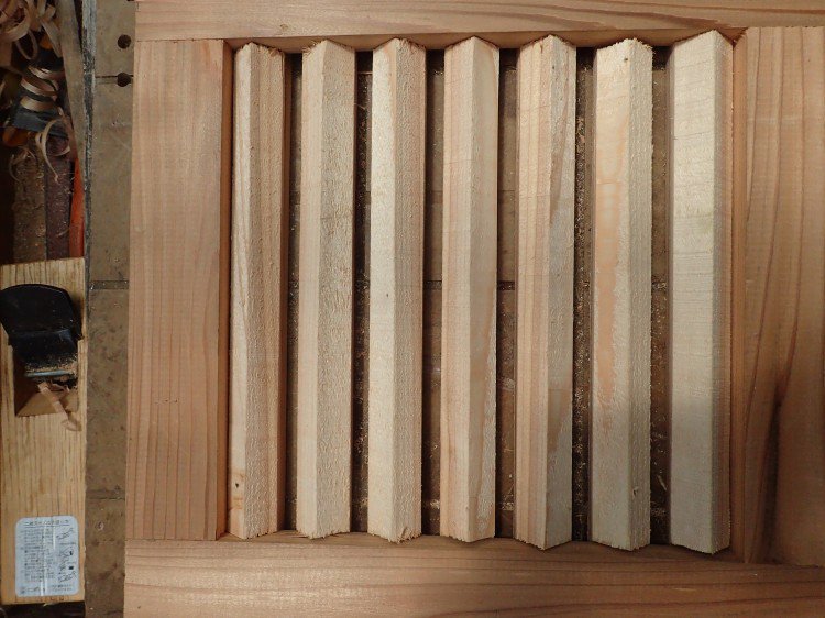 これまでの少ない経験の中ですが…重箱式では巣板は概ね巣門に対して斜めに作られるものだとばかり思っていたのですが、初めて巣門に平行に作られた巣板が確認できました。私にとっては珍しいので日誌に乗せさせていただきました。因みに垂れ蜜方式で3.8Kgの採蜜となりました。