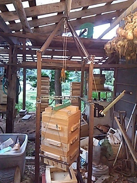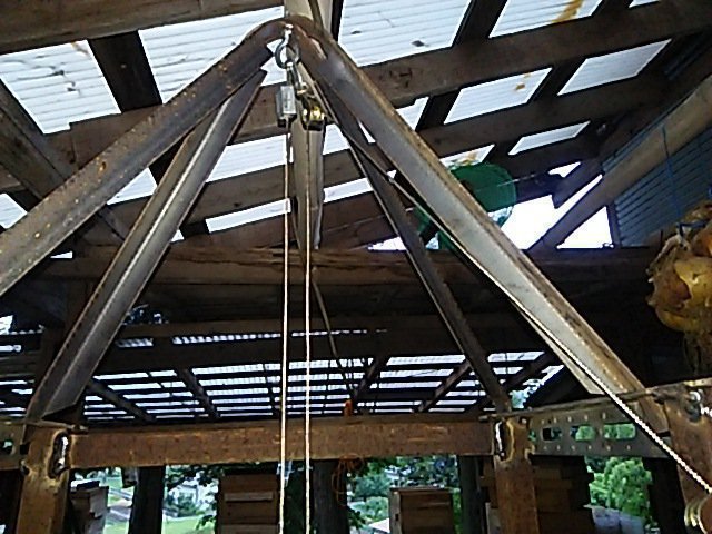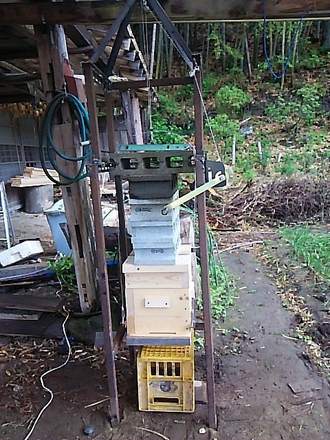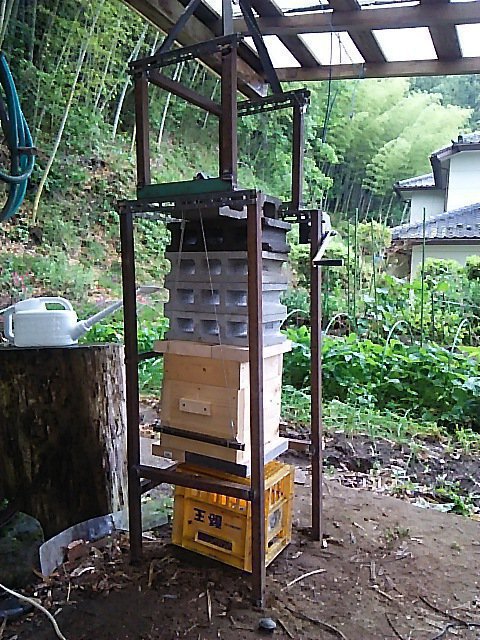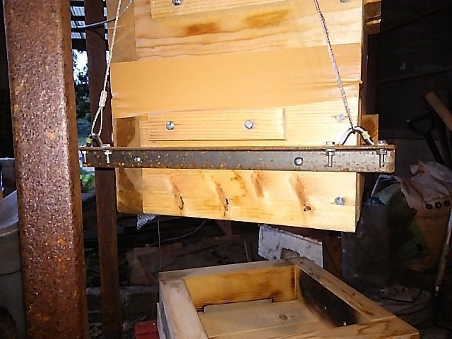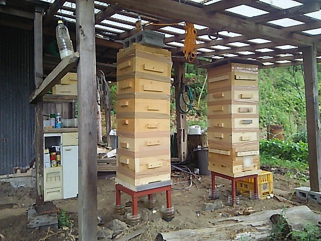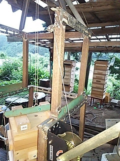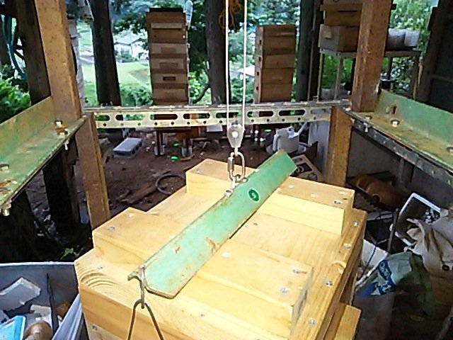 相当な重量に耐えられそうですね。私の自宅飼育群は簀子から下5段+巣門枠 簀子の上に盛り上げ巣部分が有り、軒下なので滑車に吊り秤を付けハンドウインチで吊ってみたら81㎏ありました。とても人力で継ぎ箱は出来ません。