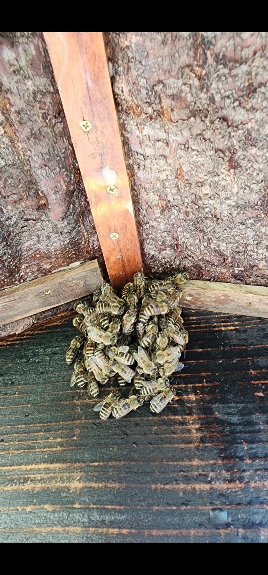 ふさくんさん こんばんは。 今日見たら飼育箱前の5mに分蜂板を設置してあるのですがそこに固まって居ました(笑) 可愛すぎて笑ってしまいました。(笑) 多分50mほど離れた方の庭先の箱が何らかの原因で解体してありましたのでそこからかなー?って思っています(笑) 手の施しようが有りません。静観です(笑) m(__)m