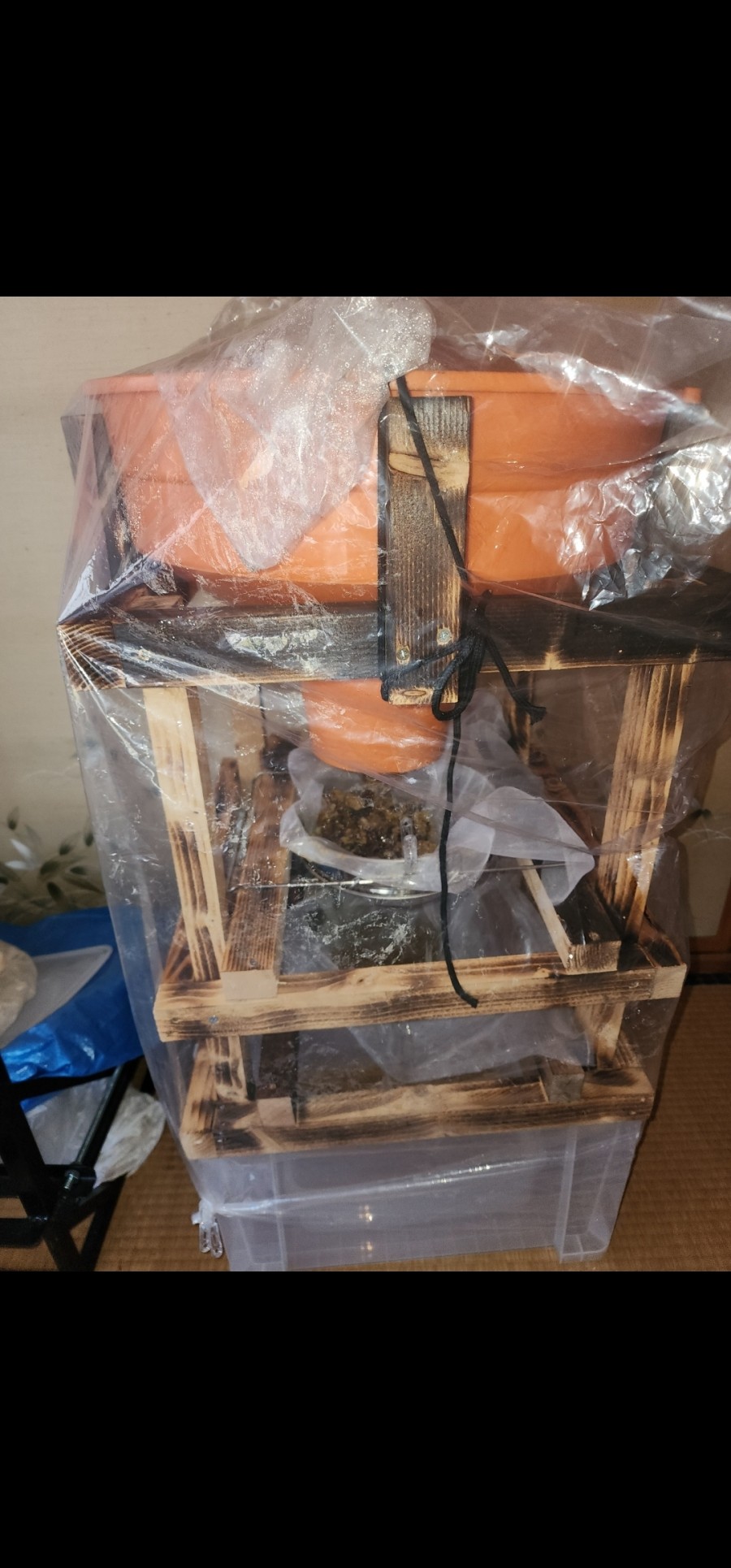 帰宅してたれ蜜の具合をを見に あらーーー大変 上のビニールの切り込みが破れて直下の濾し受けに落ちていました(笑)