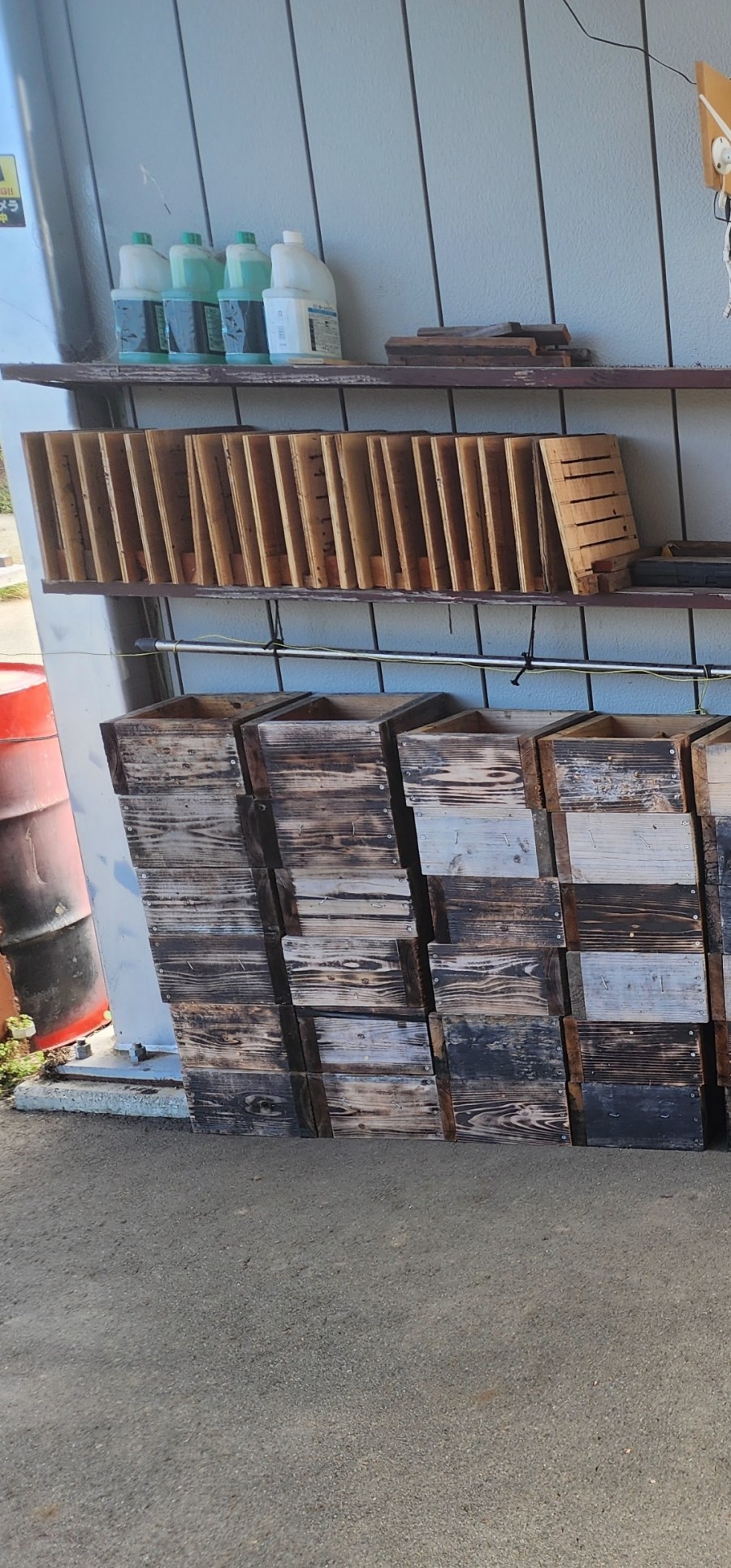 因みに来期の待ち箱を積んである場所は飼育群から200mほど離れた場所なので外での給餌?(はたして給餌と言うのか?)には何も不安を感じていません。 見ると日本蜜蜂ばかりなのできっと我が家の娘達だと勝手に思っています。(笑) 少なくとも1キロ四方には日本みつばち、西洋ミツバチ共に飼育群は居ません。 その先は分かりませんが(笑) 昨年までは500mくらいの所に3群、700mくらいの所に1群いました。 1群の方の群は8月に消滅、3群の方は高齢で辞めました。