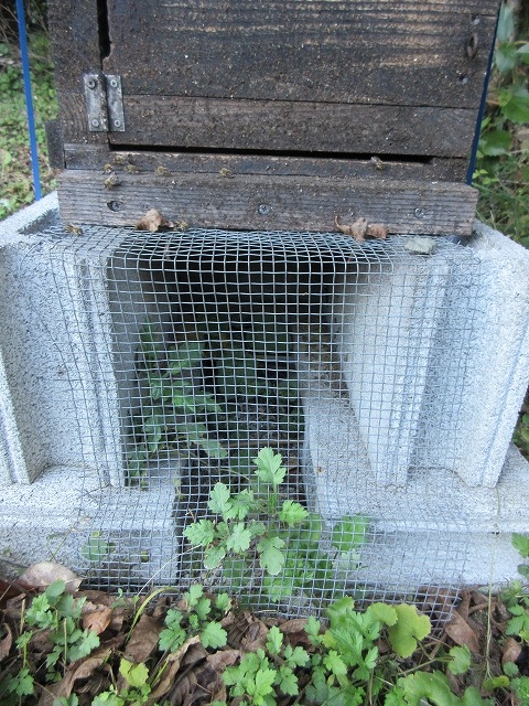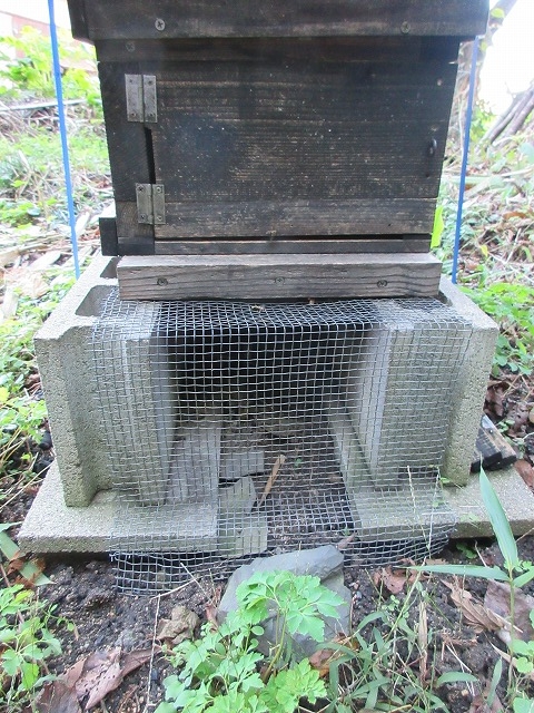 私の巣門枠には基本的に底板がありません。7mm金網が張ってあるだけです。底板があるとちびっ娘達の掃除負担やスムシの巣になるからです。巣くずは金網越しに土台ブロックや地面に落ちていくだけです。