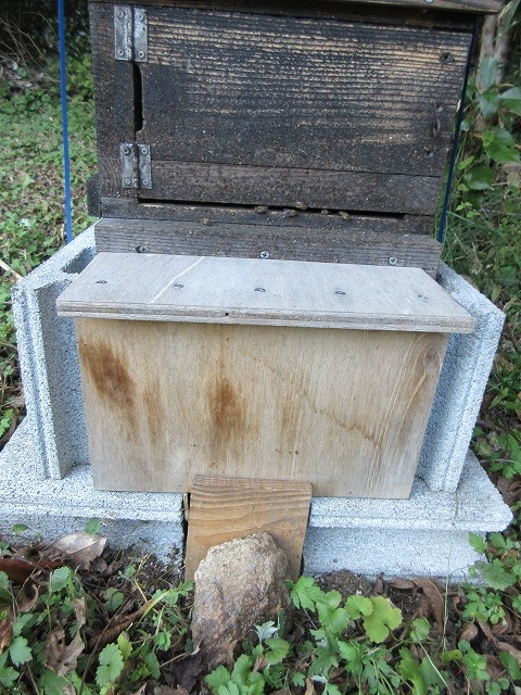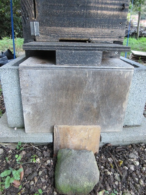 巣箱は底板のない開放巣に近い状態なので、寒風を避けるためにコンパネ板で塞いでいるのです。ブロックの隙間(円形や半円)は新聞紙や土砂で詰めています。