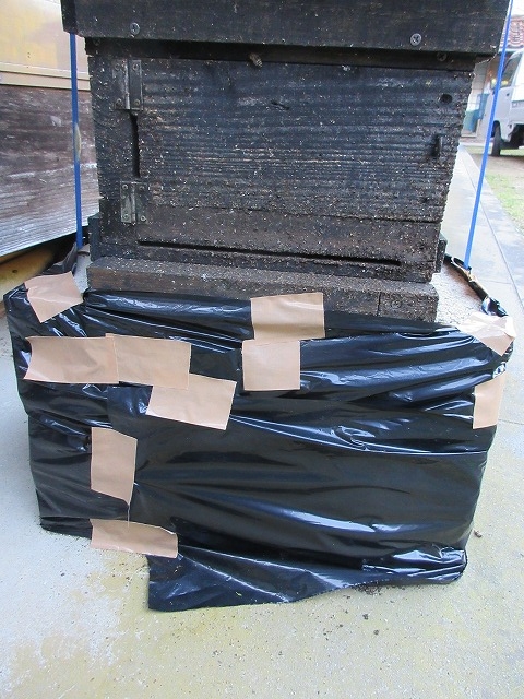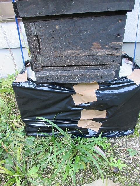 夏分蜂して増群増巣は停滞しましたが元気です。ガムテープの継ぎはぎがみっともないですね~。