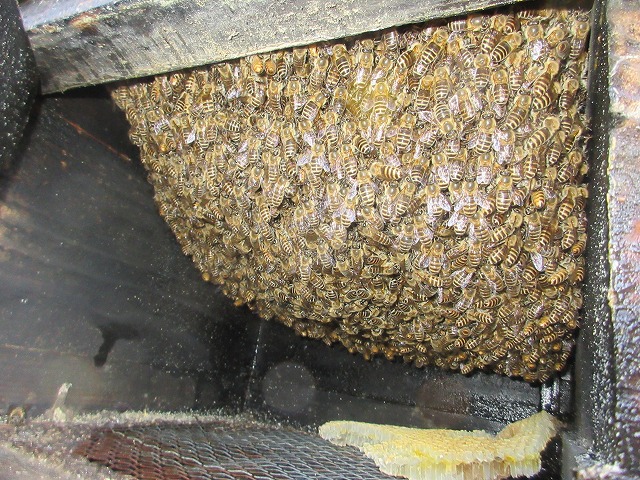 巣門を開けて内検すると増群増巣で巣門枠まで蜂球がおりていました。消費した巣板が一部転がっていますね~。10/4に1段継箱、1段カットしていたので、2段ずつにすべきだったと反省しきりです。