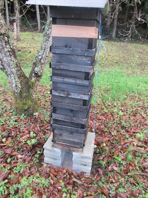 母屋の庭先に遅くなってから自然入居した3号群:5段+巣門枠群です。
