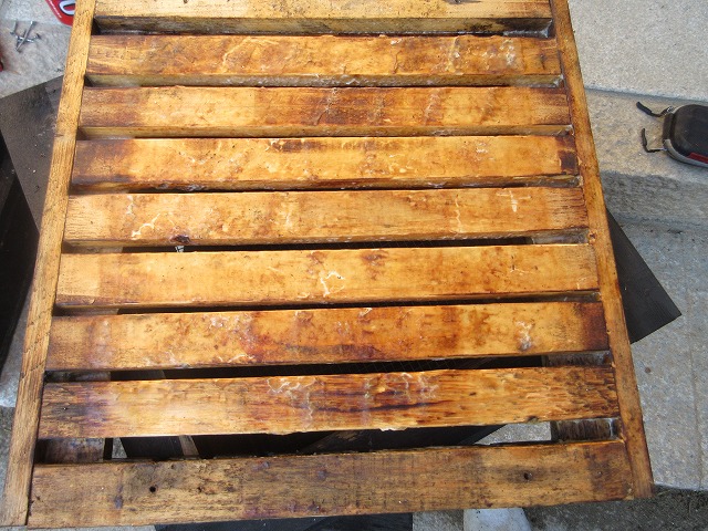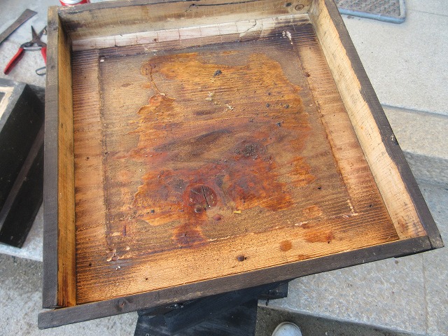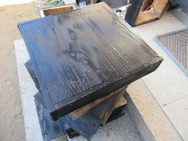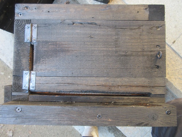 その上に、組み立てた待ち箱(飼育箱)を乗せて、雨よけや日除けをして待機させます。分蜂時期になったら待ち箱を再び解体してバーナーで炙り、使用した箱なので蜜蝋は塗りません。待ち箱ルアーや開花した金稜辺を設置して入居を待ちます。
