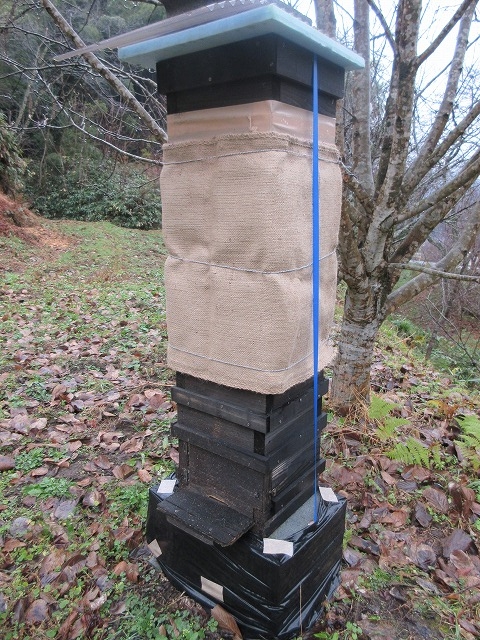 どじょっこさん おはようございます。越冬対策、ご苦労様です。ドンゴロス巻きは放任でなく過保護になるかと思いますが、上半分のみされているのは巣板が伸びている部分のみされたのですか。また、ドンゴロスを使用される時は新品ですか。もしコーヒー豆等で使用済の場合、そのままですか、熱湯消毒あるいはアルコール消毒などされるものですか。