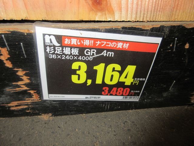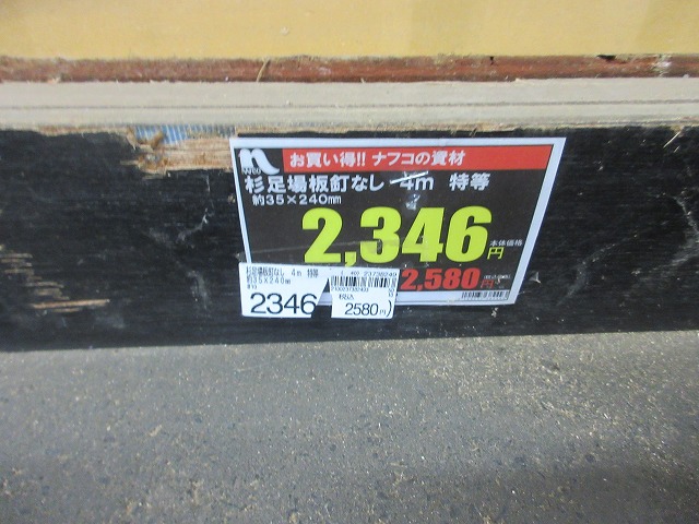 杉足場板釘なしの価格は5~6月から高くなっていませんね。消費税込みで2,580円でした。