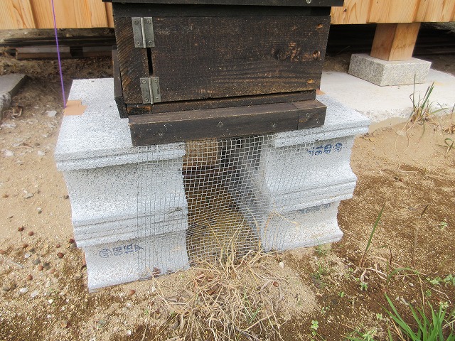 7~8年前からは巣門枠の底の部分に7mm金網を取り付けているだけです。私の飼育箱は重たい(板厚35mm、8段飼育)ので、土台がコンテナでは変形、潰れてしまいます。