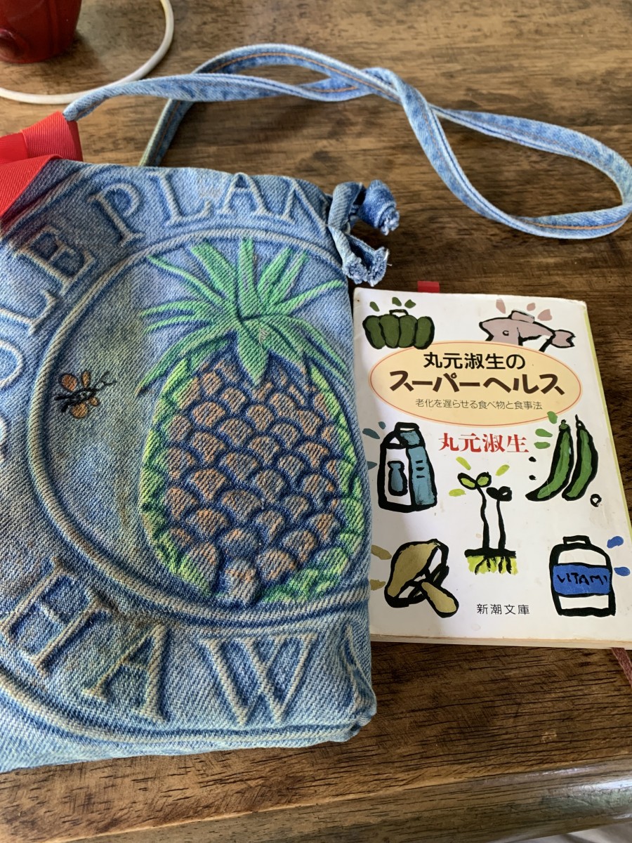 オカアチヤンに 拵えてもらったスマホバッグ と丸元淑生の本 使い古しのジーンズ生地 イラストはモリヒロクン