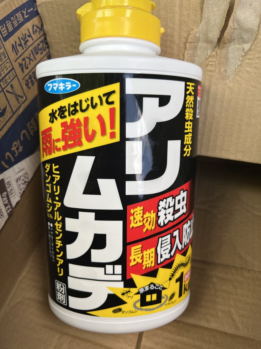 実は粉末薬剤を撒く前に、クローバーの形をしたアリの巣コロリを蟻の通り道(ビール箱の足元)に1つ設置し2日ほど様子を見たのですが、まったく効果を感じられず。