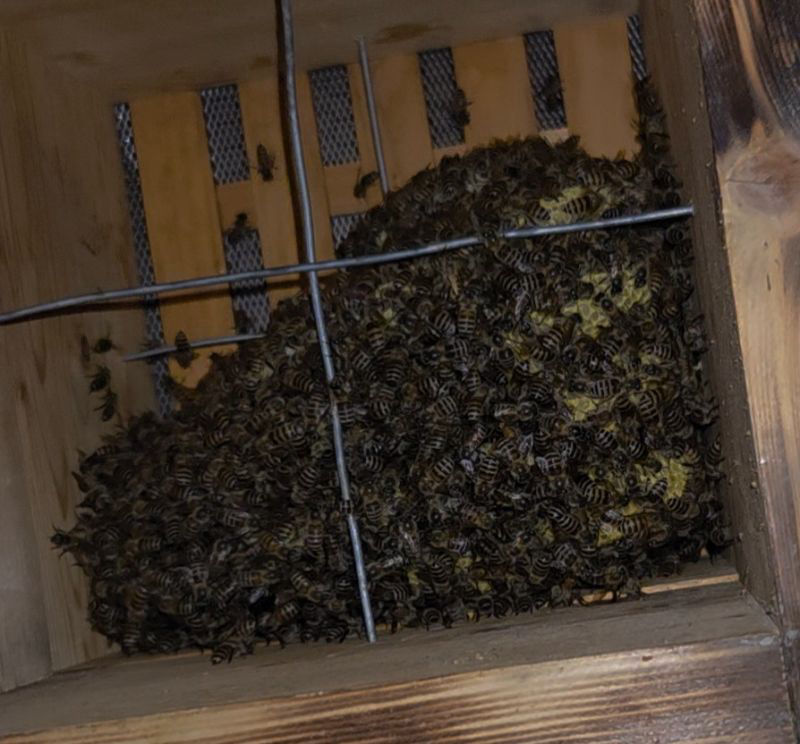 4月27日に分蜂した末っ子女王群。移動場所が決まっていたもののなかなか移動できずにいるもようやく5月16日に移動した。