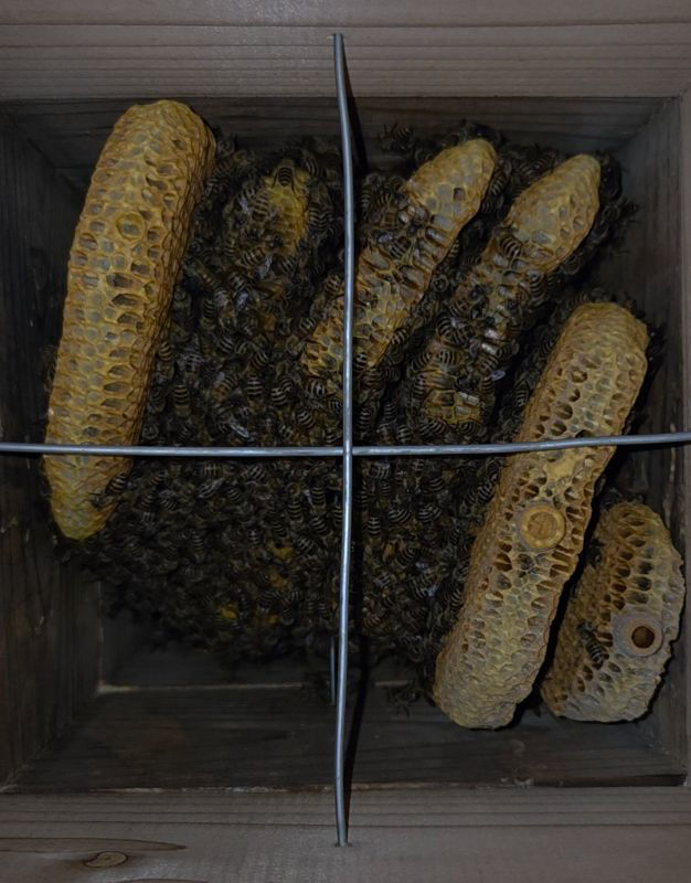 第2・3群と同じくらいの成長具合、若干成長早めかな?この巣箱にはお試しで巣箱3段目に巣落ち防止棒を普段の十字から井の巣箱にした。