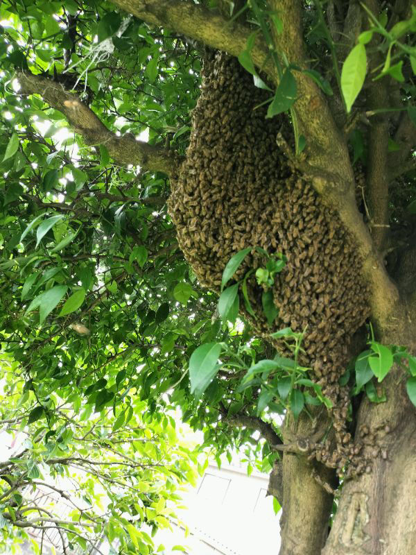 朝8時頃の分蜂でした!出掛ける前だったので、一応捕獲をしたのですが準備不足諸々重なり5ヶ所腕、両足刺されてしまいました。(T_T)