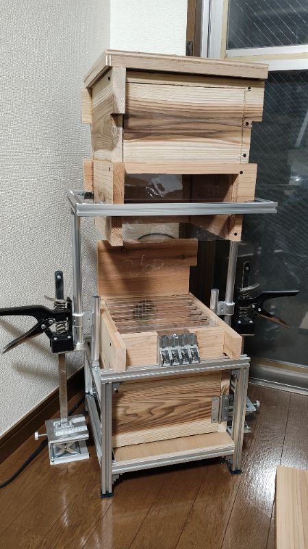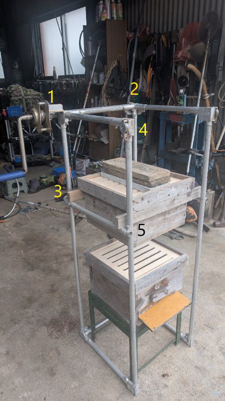 ボキのは実戦配備してないので評価ができませんが、空運転では上手くいってる気がします。利点は要素最小による軽量コンパクトです。フレーム架台に取り付くので別に足場が要らず、巣箱の軸と持ち上げの軸がピタリと一致します。構造としては、フレーム架台にポストを立てその先に軸受け(プラによる滑り)を2本持たせ2柱で持ち上げフレームを支持、その2柱をグリップジャッキ(持ち上げ)とねじジャッキ(降ろし)で押し上げます。構造上、左右のアクセスは制限され、1段ずつしか継ぎ箱できません。又、左右グリップジャッキは相応の握力を要しますし、目の前に継ぎ目が口を開いていくので、無防備でやるとなかなかのスリルを味わえますし、左右の同期はセンスと根性でやるしかありません。ねじ(ラボ)ジャッキは予め揚げておき、隙間分を降ろす時にだけ使います。グリップジャッキはロックをリリースするとガクンとしか落ちないのでスムースリリースを探すより、ねじで降ろした方が安全確実だとの判断です。スリル満点より蜂を殺したくないので、
