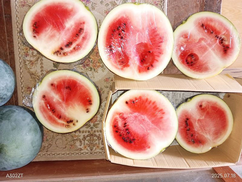 でも逆に黒玉の方(最低2㎏最高7.9㎏、4~5kg台が主流)は巻ヅル、打音、お尻の黄色味&へこみなど、どれをとっても完熟に思えるのに、切って見ると赤みが足りないんです。食べて見ると、熟れてる感じの食感なのに甘みは全然足りない。それが確認出来てる黒スイカ全部なんです(一部はコッコ達用に鶏友にあげました)。一番低い糖度は初収穫の5度で、最高は終盤の9.5度。(雨が降るとそれで糖度が下がったり、実割れが起こるみたいですね)