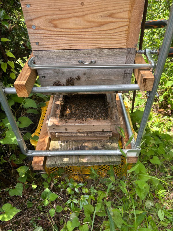 巣上げ機で持ち上げようとしたのですが、箱を抑える鉄製板が、ギリギリ締め上げても、持ち上げようとすると滑ってしまい、巣上げが出来ないのです。どうやら蜂娘達が一番下の箱にもベッタリくっ付き出して、お腹から出る蝋の成分が付着し、鉄製板が滑ってしまうらしいです。