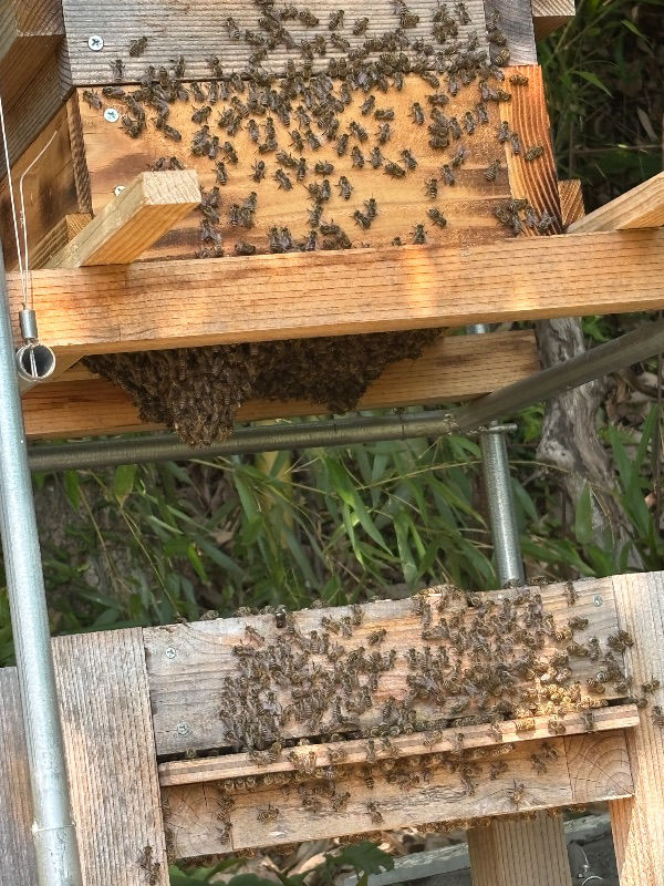 れりっしゅさん ~~~ヾ(^∇^)おはよー♪ございます。巣落ち防止棒が大きいので壁とみていますね。12番線の番線に交換をお勧めいたしますね。この巣箱は大きさが好い感じですので、安心して見られますね。自分も底板まで持ち上げて継箱後に又上げて底板を外したことが有りますね。蜜蝋が着いて居ましたね。対策は良いと思いますね。お疲れ様でした。