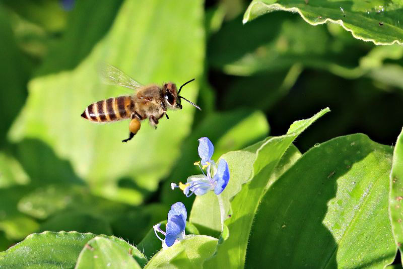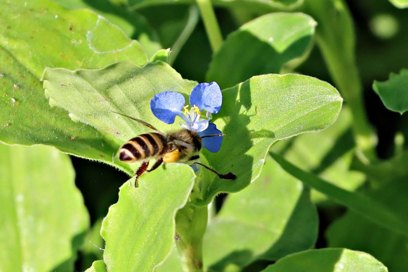 蜜源の少ないこの時期のツユクサを転々と忙しく動き回るので、なかなかピントが合いませんね。たまたまピントがマシな画像をアップしました。