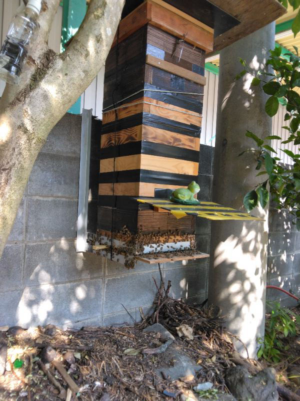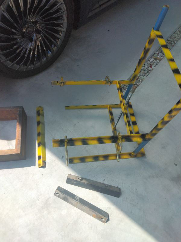 材料は廃材の薄いアングルと水道管の切れ端で溶接しました、蜂が警戒しないよう黄黒スプレーで塗り塗りしましたよ。今日はいけない事ですが暑いのでTシャツ一枚で作業しました、これまでに20回以上刺されたのでこっちの警戒も無くなりました!